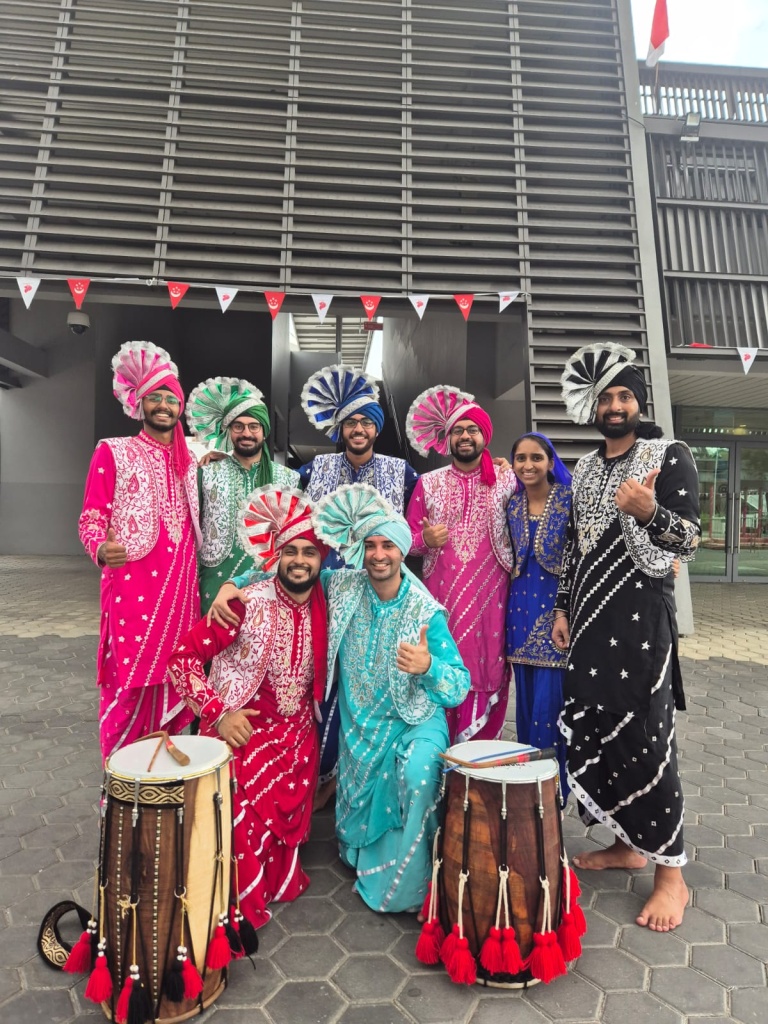 The Joshiley Bhangra troupe posing for a photo at the OCBC Square