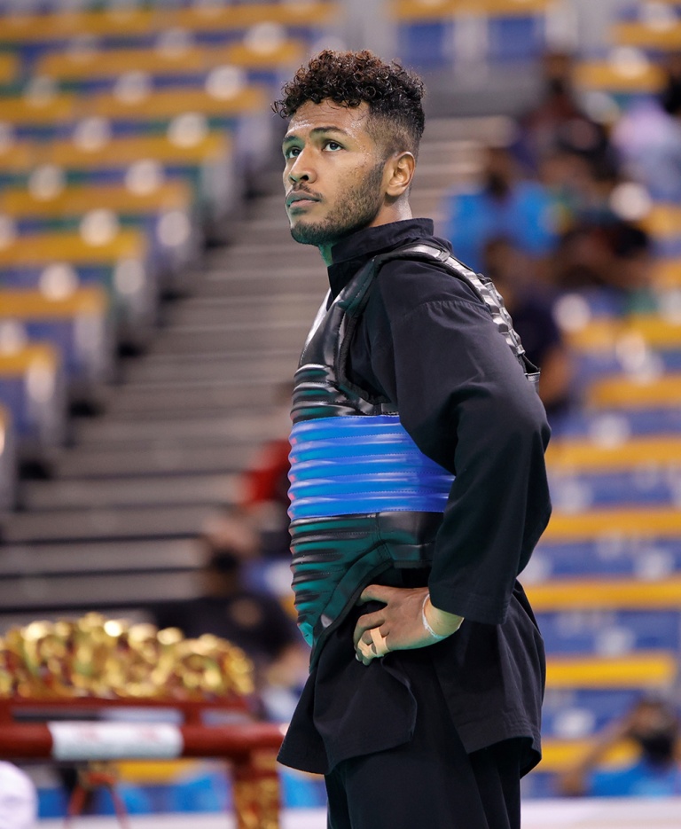 Singapore silat athletes Siti Khadijah Binte Mohamad Shahrem (left picture) and Sheik Ferdous Bin Sheik Alau’ddin (right picture), both wearing blue-and-black body protector, in competitive action. Photos courtesy of Jupong and Sia Kian Teck.