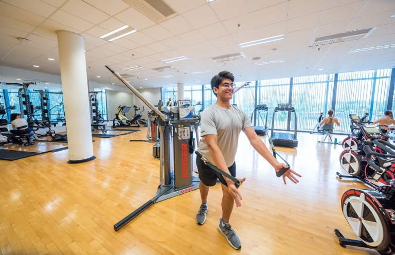 A man engaging in resistance training in the Sports Hub gym. Women gain muscle at a slower rate than men because men and women have different hormone levels.