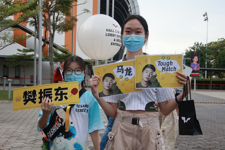 Table tennis fans supporting their sporting idols Fan Zhendong and Ma Long during Singapore Smash 2022.