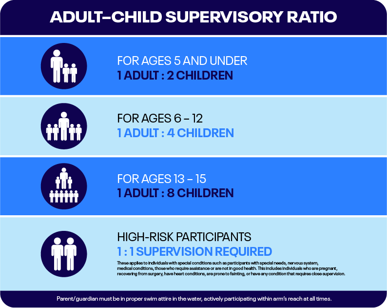 As part of our safety measures, please refer to our Pool Safety & Adult-Child Supervisory Ratio for patrons aged 15 years and below.