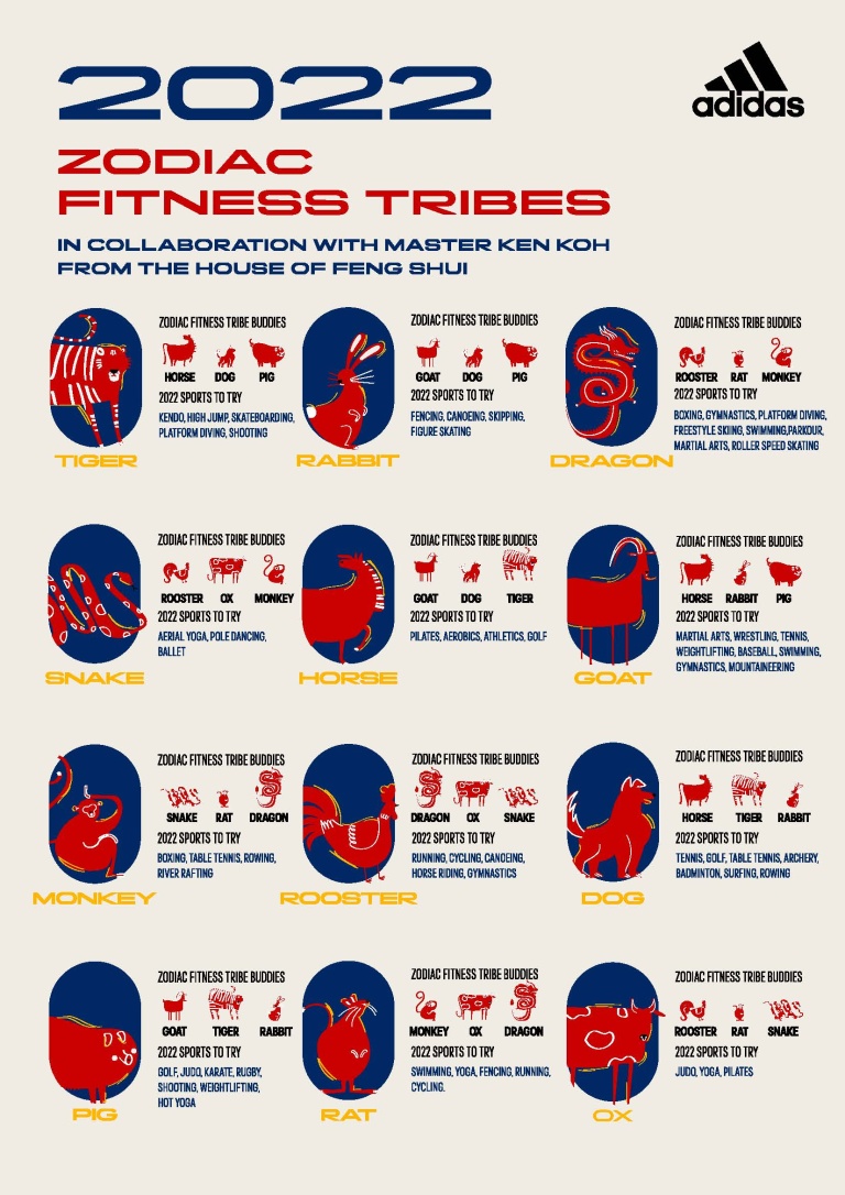 Adidas invited Master Ken Koh from the House of Feng Shui to share which sports and zodiac signs might go well together. Master Ken shared that different zodiac signs might be drawn to particular sports, and that we can consider seeking out exercise buddies with complementing zodiac signs. These are his recommendations: