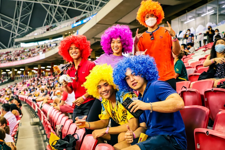 A carnival atmosphere at the HSBC Singapore Rugby Sevens 2022. (Masks were removed for photo-taking purpose.) Photo by Singapore Sports Hub.
